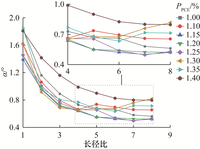 其中:D为射流直径;L为射流喷射距离,单位均为mm。按均等的时间间隔选取4张减水剂掺量不同混凝土的喷射剧烈期的图片进行处理分析,计算扩散角数值,并取其平均值记为该掺量下的射流扩散角。其中,长径比为L/d,d为喷口直径,长径比越大表明射流喷射距离越远,处理结果如图 7所示。