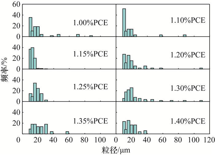 2.3.2 对粉尘粒径及粒径分布的影响粉尘粒径及粒径分布是在微观尺度上评判雾化效果的重要指标,本文选取D50用于分析喷射混凝土粉尘粒径,其含义为一个样品的累计粒度分布数达到50%时所对应的粒径大小。PCE掺量为1.00%、1.10%、1.15%、1.20%、1.25%、1.30%、1.35%和1.40%时的D50分别为12.31、9.68、10.75、12.59、14.04、15.87、15.81和13.81 μm。在PCE掺量增加的过程中,水泥的絮凝基团由于静电斥力和空间位阻的作用被逐步破坏,絮凝基团包裹的拌合水被释放,拌合物中水含量逐渐增大[36-38],混凝土流动性提高。图 9为减水剂掺量不同时粉尘粒径的频率分布图。