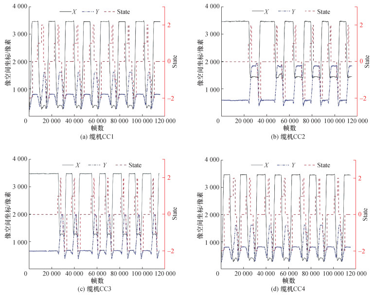 4.2 基于模式识别计算缆机吊运效率从数据集中选取一段时长达1 h的长视频序列作为工程案例,应用本文提出的基于视觉跟踪和模式识别的方法计算缆机吊运效率。图 11给出了视频中4台缆机的吊罐轨迹坐标时序变化过程和模式识别结果。由图可知,本文建立的吊运混凝土模式识别方法准确地判断出缆机的水平运输、竖直下降、卸料、竖直上升、水平返回和等待装料6种工作状态。并且还发现,缆机CC2和CC3是从约25 000帧开始吊运混凝土;缆机CC4的单次吊运循环时长最长,其中等待装料的时间较长;缆机CC1的吊运循环次数最多,浇筑强度最高。