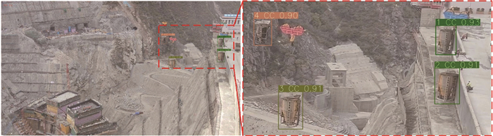 本研究的YOLOv5模型经过训练后,目标识别精度、召回率、F1分数(F1-score)、平均识别精度(mAP)和每秒帧数(FPS)分别为0.971、0.973、0.972、0.982和30.559。模型训练的准确率、召回率与置信度的关系如图 2所示,当置信度取0.6时,准确率和召回率高达0.9以上。采用该训练后的YOLOv5模型对缆机吊罐进行识别,结果如图 3所示,图中所有吊罐目标均被识别出来(局部放大区域中各吊罐上方的标签由“ID缆机标识符号置信度”组成)。因此,训练后的模型可实现对缆机吊罐的高精度快速检测,完全满足工程需要。