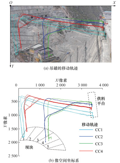 在混凝土坝施工过程中,缆机的工作模式包括3种,分别为:1) 吊运混凝土,2) 零星作业(吊运施工机械、钢筋、模板等物体),3) 停工与检修[8]。后2种模式下,吊罐一直被放置在供料平台上,位置坐标保持不变,所以只有在吊运混凝土模式下吊罐的位置坐标会随时间发生变化。因此,可以依据吊罐位置变化识别缆机吊运混凝土模式。图 7给出了应用上述视觉跟踪技术获取到的吊罐移动轨迹,采用4台缆机(CC1—CC4)同时浇筑坝块,其中CC1和CC4负责浇筑1号坝块,CC2和CC3负责浇筑4号坝块。缆机吊运混凝土的循环过程为:吊罐在供料平台装载混凝土,然后运输至目标坝块,卸载混凝土,再将空罐返回至供料平台,等待装载混凝土。重复该循环,直至目标坝块浇筑完成。进一步将吊罐的移动轨迹数据绘制到图像空间坐标系中,如图 7b所示,不同吊罐的移动轨迹采用不同颜色进行区分,可直观地记录缆机吊运混凝土过程中吊罐位置的变化。