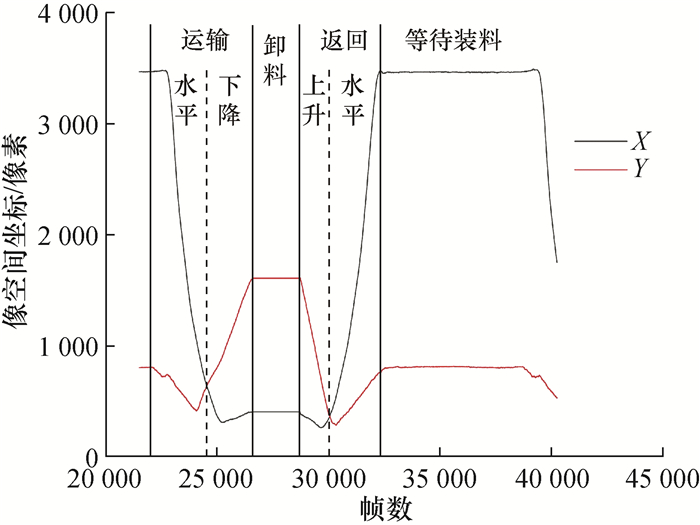 依据吊罐在图像空间坐标系中X和Y方向的位置随视频的时间帧数的变化情况绘制图 8,用以分析吊罐轨迹的时序特征。由图可知,与物理空间中缆机吊运混凝土过程相对应的,吊罐轨迹的时序特征也可明显分为运输、卸料、返回和等待装料4个工作状态,其中运输状态又可分为以水平或下降为主的运输过程,返回状态又可分为以上升或水平为主的返回过程。可见,吊罐轨迹的时序特征是从海量轨迹数据中识别缆机吊运混凝土模式和工作状态的可靠依据。