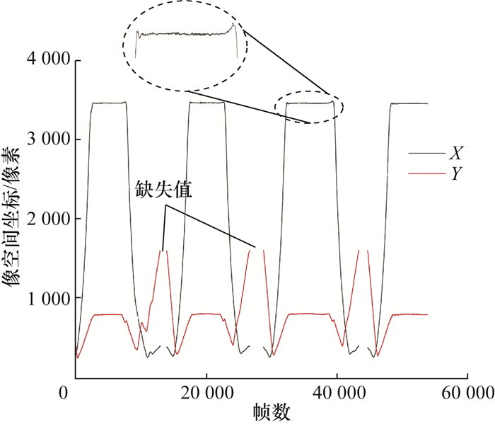 由于数据采集中存在吊罐被遮挡的情况,YOLO检测中可能存在漏检误检等问题,采用视觉跟踪方法获取的吊罐轨迹可能会在某些连续帧出现目标缺失。并且目标识别框的大小是不稳定、不连续的,即使同一目标在连续视频帧中也会存在抖动,对轨迹数据造成复杂的噪声干扰。因此采用视觉跟踪方法获取的轨迹是一种存在缺失值和噪声问题的时序数据,如图 9所示。为此,本文采用二阶B样条曲线插值方法,插补轨迹数据的缺失值。相对于线性插值、阶梯插值等方法,样条插值方法补充的时序数据较平滑[26, 27]。采用Savitzky-Golay滤波算法对轨迹数据进行降噪[28],如式(8)所示,对一定长度窗口内的数据点进行多项式拟合,可以确保轨迹数据的形状、宽度不变,不改变其变化特征。