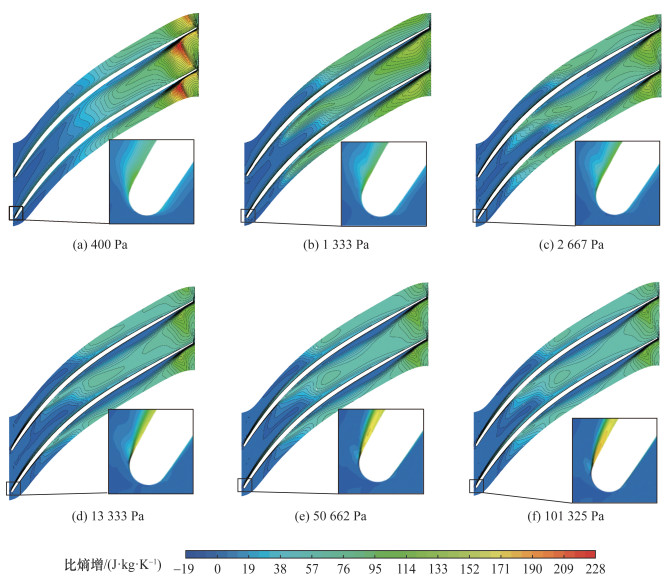 图 10为不同入口压强下h=0.1时叶轮子午流线回转面(blade-to-blade,B2B)上比熵增的分布,由图可知,随着入口压强减小,由流道内尾迹导致的比熵增增加,而在叶片前缘吸力面处比熵增则减小。当入口压强大于2 667 Pa时,叶片前缘吸力面处比熵增较其他位置大,即吸力面边界层损失较强。当入口压强小于等于2 667 Pa时,叶轮出口处比熵增较高,该位置的熵增主要由二次流以及反流造成,当压强减小至400 Pa时,叶轮出口处流动损失显著增强,由3.3节对流场的分析可知,反流更为显著。