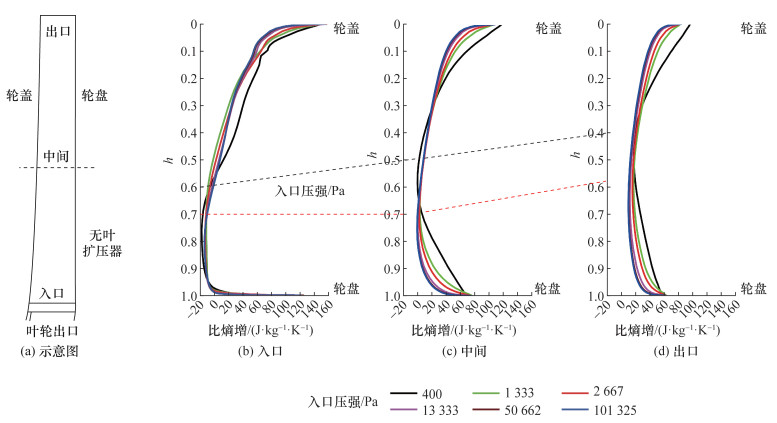 4) 无叶扩压器内轮盘侧边界层厚度随入口压强减小而增加,而当入口压强减小至400 Pa时厚度显著增加,边界层内气体速度明显减小,比熵增显著提高。