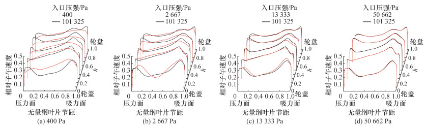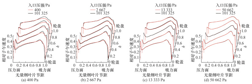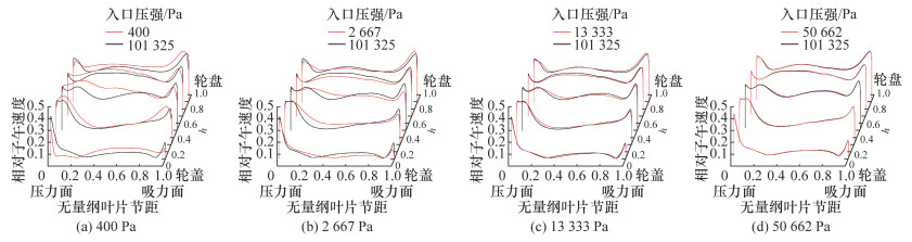 图 12—14为不同测量面上相对子午速度的分布。由测量面Ⅰ上的分布可知,当入口压强大于2 667 Pa时,相对子午速度分布差异不大,而在吸力面附近h=0.1处子午速度随入口压强增加而减小,说明此处边界层分离情况随入口压强的增加而加强。在入口压强为400 Pa的条件下,吸力面附近的相对子午速度比101 325 Pa条件下的小,而压力面附近的相对子午速度则偏大,即入口压强越低,流道内相对子午速度的周向分布越趋于平缓。比较测量面Ⅲ上h=0.1的相对子午速度分布,可知压强越高,中间低速区越宽,即尾迹发展更充分,表明入口压强越低,尾迹产生的位置越靠流道下游。由测量面Ⅵ上的相对子午速度分布可知,在任何入口压强条件下,叶轮出口处低速流体团基本可覆盖h≤0.3的区域,在入口压强为400 Pa的条件下出口处气体子午速度比高压强的偏大。不同测量面上压力面和吸力面处子午速度的梯度均随着入口压强减小而减小,即壁面上的边界层厚度随入口压强减小而增加。