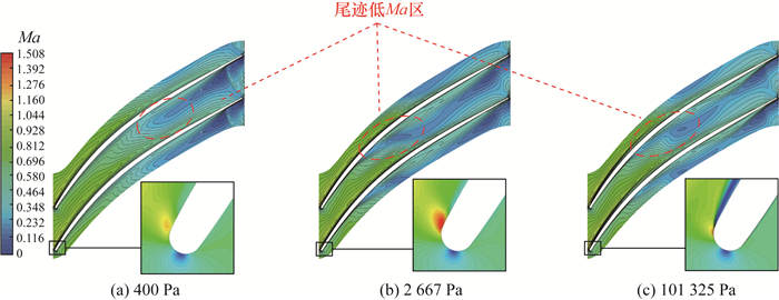 图 15和16分别显示了h=0.1时B2B面上的流线分布以及Ma分布。由图可知,入口压强为2 667 Pa时的流线和Ma分布与压强为101 325 Pa时基本一致,但在叶片前缘吸力面处,压强为101 325 Pa的边界层分离较为显著。相比于高压强,在入口压强为400 Pa的条件下,由压力面指向流道中间的流线开始位置以及低Ma区更靠近下游,即尾迹发生位置更接近下游,另外在叶轮出口处有明显反流和二次流。