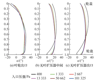 气体流入无叶扩压器后,低深度处绝对气流角依旧随入口压强降低而增加,高深度处气流角随入口压强降低而减小,且在400 Pa处出现明显突变。由图 17知,当入口压强为400 Pa时,轮盖和轮盘处的气体速度梯度更小,即边界层厚度更大,边界底部甚至出现湍流,故而导致轮盘侧较大深度范围内气流角显著低于其他压强。在流道中间及低深度位置,绝对气流角随入口压强的减小而增大,因为边界层厚度随压强减小而增大,故流道中间气体子午流速更大,使气流角增加。