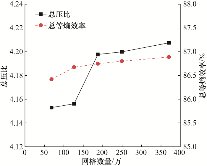 为减少计算量、节省计算时间,选择单流道作为计算模型,如图 2所示。图 3为Krain实验中6个测量面Ⅰ—Ⅵ子午位置示意图[5]。流道采用结构网格划分,第1层网格厚度为6 μm,整个计算域除叶片尾缘截断面外其他区域无量纲壁面距离d+值均小于10,网格数量为1.88×106,满足网格无关性检验,模型网格划分示意图和网格无关性检验分别如图 4和5所示。入口给定总压、总温和速度方向,出口给定质量流量,所有壁面均为无滑移绝热边界。若均方根残差小于10-4,进、出口流量差小于0.01%,效率变化小于0.01%,则计算收敛。
