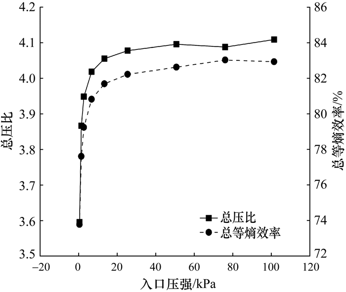 目前关于负压条件下,尤其是关于入口压强低至400 Pa的离心压缩机性能的研究文献较少,且未见探究负压压缩机内部流动特征研究的相关公开资料。另外在研制负压离心压缩机过程中发现,相同入口体积流量下入口压强增加会引起压比提升,因此有必要开展入口压强对离心压缩机性能影响及机理的研究,该研究还有助于在负压离心压缩机的初始设计阶段,采用基于正压的一维性能模型预测负压离心压缩机性能时提供修正方向,提高预测精度,减少冗余设计时间。