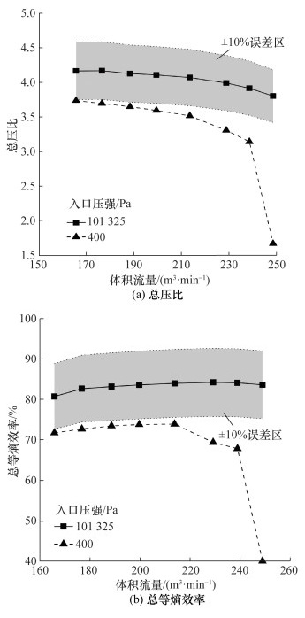 比较入口压强分别为400和101 325 Pa条件下叶轮变工况性能,结果如图 8所示,阴影区域表示101 325 Pa下性能波动±10%的范围。由图可知,在变工况流量范围内,当入口压强为400 Pa时的叶轮性能均比压强为101 325 Pa时低10%以上,且随着流量增加,偏差增大。在400 Pa的入口压强下,叶轮的稳定工况范围更窄,当体积流量为240 m3/min时会发生堵塞。