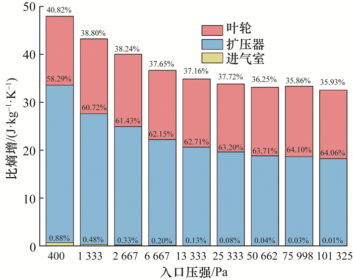 图 9为不同入口压强下各元件的比熵增,由图可知,随着入口压强减小,各元件比熵增增加,且入口压强越小,比熵增增加越快,即气体通过压缩机级的流动损失随压强的减小而增加。比较3种元件的比熵增占比可知,扩压器比熵增占比随着入口压强减小而增加,即无叶扩压器对流动损失的贡献随压强减小而提高。