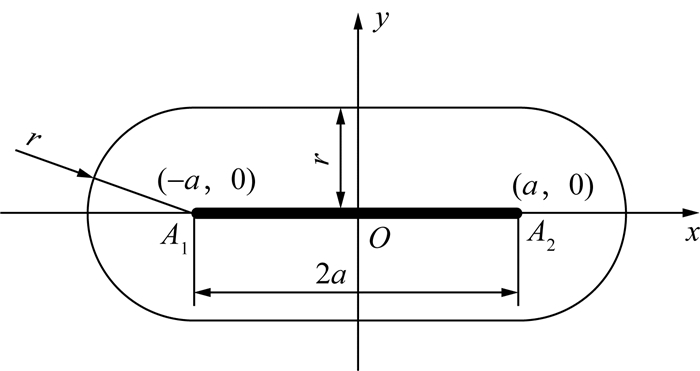长圆孔示意图如图 1所示,定义点A1和A2位于x轴上且关于y轴对称,线段A1A2的长度为2a。由图可知,平面上横坐标绝对值不大于a的点到线段A1A2上点的最小距离即为到线段所在直线的距离;平面上横坐标绝对值大于a的点到线段A1A2上点的最小距离即为到较近的端点的距离。在极端条件下(r=0),长圆形退化为线段A1A2;当线段端点A1和A2重合时,长圆形退化为半径为r的圆。长圆形的形状由2a和r决定,而其位姿则完全由线段A1A2的位姿决定。工业应用中一般采用2a和r表示长圆孔的尺寸。