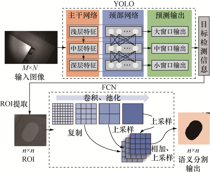 因此,本文提出将分割任务分为ROI提取和语义分割2步,设计了如图 2所示的深度学习语义分割框架。由图可知,首先由YOLO网络对输入尺寸为M×N的图像中的长圆孔目标进行目标检测形式的粗定位,完成后提取ROI,将提取的尺寸为n×n的ROI输入到串联的FCN网络中,在长圆孔面积占比更大的图像中完成语义分割,降低训练难度并提高鲁棒性。M、N由实施系统的相机硬件决定,n根据长圆孔与输入图像的比例灵活选取,一般比所拍摄长圆孔的最大像素的长度大20像素左右。FCN输出二值化图像,不同颜色分别代表长圆孔区域和背景,其尺寸为n×n。将其还原到原输入图像中,可以得到原图像中的长圆孔区域,经进一步处理完成长圆孔位置定位。