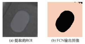 长圆形具有中心对称特征,理论上FCN输出区域的重心就是定位所需的长圆孔中心。但在实际应用场景中,不仅环境和光照条件可能发生变化,而且训练环境和实际应用环境也可能不同,再加之FCN分割结果本身并不具有特别高的精度,分割结果很有可能出现一定程度的变形,如图 3所示,分别为提取的ROI和FCN的输出图像,对比可见FCN的输出图像只能大致保持长圆孔的形状,在中部线段的外形部分发生了弯曲变形。因此,为了在保证精度的同时提高算法的鲁棒性,本文根据长圆孔特有的几何特征设计了基于传统图像的定位算法。