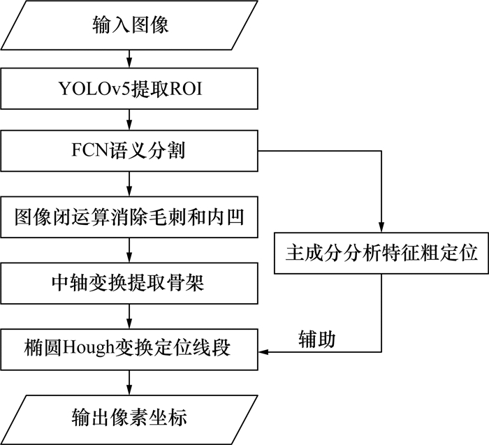 2.3 算法实现算法流程如图 4所示。图像输入1 920像素×1 200像素的单通道灰度图,其中长圆孔的最大尺寸不超过110像素。YOLO网络采用YOLOv5,FCN以ResNet-101作为主干网络。YOLO在进行目标检测时理想情况下会检测出长圆孔的最小外接矩形,但是长圆孔处于不同角度时占提取ROI的面积比例会有明显差异,因此统一ROI尺寸为128像素×128像素,中心即为YOLO输出的外接矩形的中心。