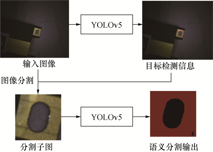 考虑到实际装配时的效率要求,语义分割网络需保证快速和轻量化,此外需具有一定程度的泛用性。基于上述需求,本小节提出了一种基于YOLO(you only look once)和全卷积神经网络(full convolutional net,FCN)串联网络架构的视觉检测分割技术方案。YOLO网络是用于目标检测的深度学习网络,其特点是牺牲一部分精度换取高效率的目标检测[18]并提取出感兴趣区域(region of interest, ROI)。FCN则是经典的语义分割方法,去掉全连接层以输出空间分割图[19],由于仅有卷积层,FCN可以接受不同的输入图像尺寸,但并不能高效地提取全局信息。