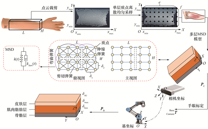 1 建立皮肤MSD模型皮肤下分布有肌肉和脂肪组织,肌肉影响皮肤弹性和表面张力,脂肪能缓冲由外力引起的皮肤形变。肌肉和脂肪下的骨骼具有支撑和约束皮肤形变作用。由于肌肉和脂肪相互包围,难以区分,因此,为简化皮肤三维形变仿真模型,把肌肉和脂肪统称为肌肉脂肪,并提出皮肤、肌肉脂肪、骨骼3层MSD模型,模拟皮肤受外力后的表面三维形变。皮肤、肌肉脂肪和骨骼的厚度分别为δski、δmus和δbon,MSD模型建立过程如图 1所示。首先,对相机获取的长、宽、高分别为L、W、H的作业区域的点云进行滤波和裁剪,获取点云集合PC={PC1, PC2, …, PCn},其中PCi=(xi, yi, zi), i=1, 2, …, n,为PC中第i个点在X、Y和Z轴方向的坐标。结合式(1)确定MSD模型在X和Y方向的边界位置分别为xmin、xmax和ymin、ymax。由于皮肤表面为曲面,因此,MSD模型的皮肤层边界位置zmean为PC在Z方向的平均值,肌肉脂肪和骨骼层质点在Z方向的边界位置分别为zmean-δski和zmean-(δski+δmus),各边界位置表示如下: