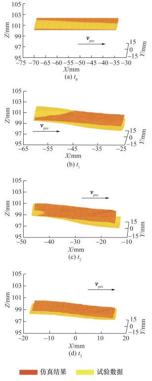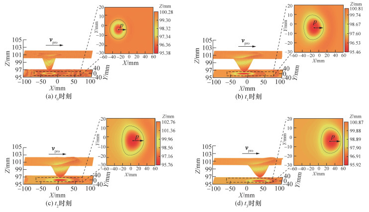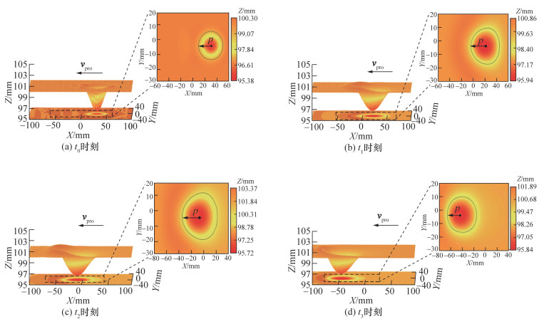 小臂和大臂按摩仿真试验中4个时刻的结果如图 9和10所示。t0为末端执行器下压达Fnor大小为5 N时刻,此时探头与皮肤接触区域呈单椭圆形,表征皮肤的各向异性,随着探头移动,皮肤的拉伸和堆积形变逐渐增加,探头与皮肤接触区域在平面上呈双椭圆形,并且在移动方向上椭圆短轴轴长p逐渐增大,该现象与文[13]中通过内窥镜观察的接触区域皮肤形状一致;t2时刻形变达到最大;在t2—t3时刻皮肤处于黏滑状态,该阶段皮肤形变有所释放,p逐渐减小,仿真结果符合实际人机接触运动下的皮肤摩擦形变机理。