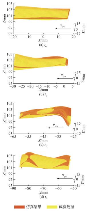 为进一步分析形变误差,分别截取相同区域的质点和点云信息进行分析。针对相机和环境因素引起的误差,先通过滤波处理去除噪声,再通过ICP(iterative closest point)配准对齐点云和质点位置信息。处理后的质点和点云经过3次样条插值进行曲面拟合,试验结果如图 11和12所示。