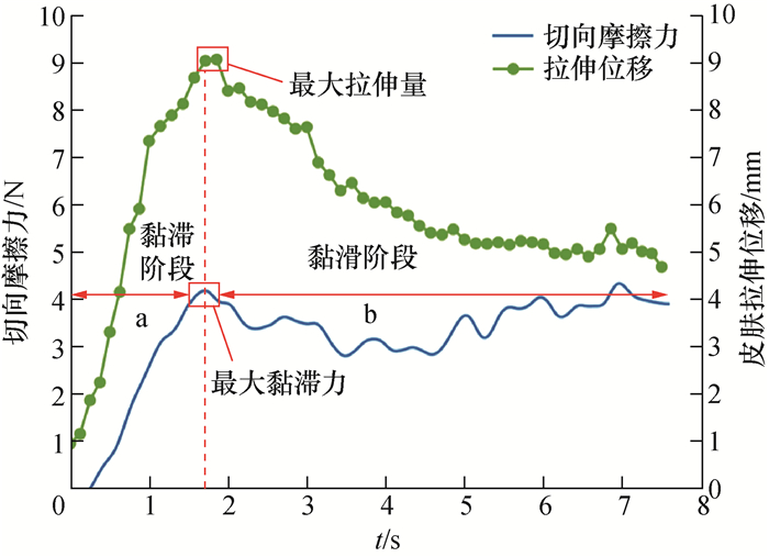 2.2 皮肤黏滑摩擦机理刚体-柔性接触中,由于皮肤具有黏弹性,因此,末端执行器与皮肤间的切向摩擦力变化复杂。在法向力Fnor的大小为5 N,作业速度为10 mm/s工况下,借助散斑成像技术获取切向摩擦力与皮肤形变的关系,如图 2所示。当法向载荷保持恒定时,皮肤切向摩擦力经历黏滞和黏滑2个阶段,其中黏滑阶段又有滑动和黏滞2种状态。阶段a为黏滞阶段,皮肤拉伸形变和切向摩擦力同时增加至最大值,此时皮肤与执行器一起移动,执行器前方皮肤堆积,后方皮肤持续拉伸;阶段b为黏滑阶段,由于皮肤与执行器间相对滑动,因此执行器前方堆积的皮肤得到释放,皮肤拉伸形变不断减小,切向摩擦力下降并在一定范围内波动。从微观角度分析,由于皮肤与执行器间微凸体高度不一致,因此只有部分微凸体接触。微凸体接触面积越大,黏着力越大。当施加于皮肤的切向载荷大于最大黏着力时,微凸体间发生相对滑动,进入黏滑(滑动)阶段;反之,微凸体间保持相对静止,处于黏滑(黏滞)阶段。