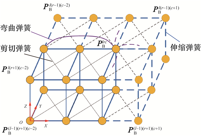 皮肤MSD模型模拟过程需要对各质点建立动力学方程,通过求解动力学方程更新质点位置信息。MSD模型中质点空间位置关系如图 5所示,质点j的位置为PBlrc时,通过伸缩、剪切和弯曲弹簧与相邻质点连接,由Kelvin-Voigt模型可知,该质点合力Fj表示如下: