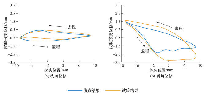 为验证MSD模型的准确性,以文[14]所述试验条件和数据进行仿真试验,监测球形探头在皮肤表面单程17.6 mm的往复直线滑动过程中某定点运动的法向和切向形变位移变化,仿真结果如图 7所示。仿真误差如表 1所示,法向方向仿真精度较高,平均误差为0.157 mm,最大误差为0.437 mm;切向方向与文[14]试验结果整体趋势一致,平均误差为0.562 mm,最大误差为1.141 mm。切向误差比法向误差较大的主要原因是文[14]仅提供了一个皮肤等效弹性模量,建模时忽略了皮肤法向和切向的各向异性,且在MSD模型参数确定时假设皮肤层、肌肉脂肪层和骨骼层具有相同的力学性能。