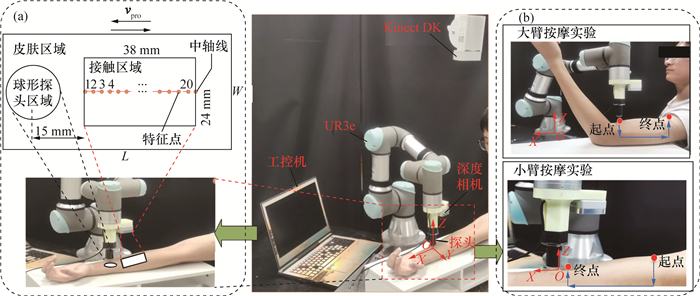 为进一步验证MSD模型的准确性,搭建如图 8所示的机器人手臂按摩试验平台。工控机为Windows 10 64位操作系统,搭载i5-7300 CPU(central processing unit)。机械臂选用UR3e协作机器人,末端配置R为10 mm的半球形探头,并搭载Intel RealSense D405短程深度相机,获取作业中曲面三维点云信息。Microsoft Azure Kinect DK相机用于确定作业区域位置信息。选择24岁健康成年男性的小臂和大臂内侧区域进行机器人按摩试验,分别测量皮肤拉伸和堆积形变。形变误差分析区域如图 8中a区域所示,考虑末端深度相机和探头接触皮肤时被遮挡,选取距探头前进的前方或后方15 mm处的38 mm×24 mm区域进行堆积或拉伸形变分析。按摩试验区域如图 8中b区域所示。初始时刻探头未与皮肤接触,随后探头沿Z方向下探,当Fnor的大小为5 N时,机器人保持Fnor不变,探头以1 mm/s的速度沿X方向移动,行程为100 mm。