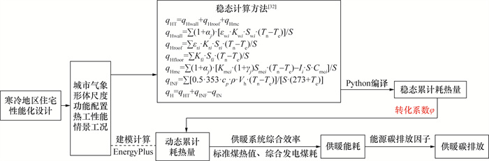 在寒冷地区住宅设计阶段,建筑耗热量可通过EnergyPlus等动态模拟软件计算得到[30],再结合供暖系统综合效率、标准煤热值、综合发电煤耗计算出供暖能耗,最后乘以相应的碳排放因子,即可求解供暖碳排放。然而,动态模拟耗时较长,会干扰设计思路和方案推进。同时,能耗实测值也易受住户生活方式的影响,难以在设计阶段被有效控制。