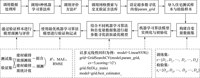 2 研究方法 2.1 预测内容住宅设计参数数据、气象数据、建材和供暖碳排放统计数据是采用机器学习算法模型预测寒冷地区住宅碳排放的基础。设计参数调试会改变设计方案,进而对建材用量、建筑运行效能及相应碳排放产生重要影响[28]。在模型训练过程中,建材碳排放可根据住宅项目工程量清单中各类建材用量进行统计换算,并考虑钢材与玻璃等可再循环利用建材的碳排放折减[29];运行碳排放则主要依托建筑负荷(或能耗)的模拟结果或实测数据。