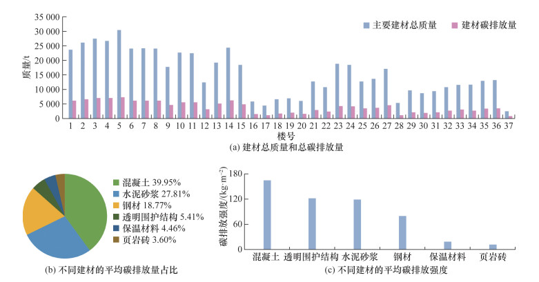 本研究调研、收集了37栋近7年建成的寒冷地区钢筋混凝土剪力墙结构住宅项目资料(图 3),据此统计各栋住宅的建材用量,并结合相关标准[33]中的碳排放因子计算其碳排放量。其中: 1—8号楼为二梯四户,9—11号楼为一梯六户,12、14号楼为二梯三户,13号楼为一梯八户,15—27号楼为一梯两户,28—37号楼为一梯两户。各栋住宅的建材总质量、总碳排放量,以及不同建材的平均碳排放占比和碳排放强度如图 4所示。在建材碳排放方面,混凝土、水泥砂浆和钢材的碳排放占比较大,合计约占住宅建材总碳排放量的86.52%。透明围护结构的碳排放占比略高于保温材料和页岩砖。在建材碳排放强度方面,混凝土碳排放强度最高,其次分别为透明围护结构、水泥砂浆和钢材。