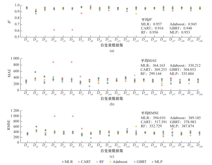 在得到的120个最优模型中,针对不同自变量数据集,为实现最好的预测性能应分别采用以下机器学习算法:Dc1、Dc16、Dc17采用MLP,Dc2、Dc15、Dc19采用RF,Dc3、Dc5—Dc8、Dc10采用GBRT,Dc4、Dc11、Dc14采用MLR(有截距项,下同),Dc9、Dc12、Dc13、Dc16、Dc18、Dc20采用CART。不同自变量数据集在MLR中的平均预测R2最高,其次分别为RF和MLP。然而,不同自变量数据集在RF中的平均预测MAE和RMSE最小。与之相比,CART模型的平均预测R2最低,且平均预测误差最高。MLR模型的平均预测误差略低于CART。此外,不同自变量数据集在CART中的预测R2、MAE和RMSE标准差最大,但在RF中的预测R2和RMSE标准差最小,且在Adaboost中的MAE标准差最小。Dc8在各个机器学习算法中的平均预测性能最优(平均R2=0.967,平均MAE=277.342,平均RMSE=315.898),且各项预测性能的标准差相对较低。Dc2、Dc4和Dc6在不同机器学习算法中的平均预测性能最差。再者,与其他自变量数据集相比,Dc1更适用于MLR,Dc16更适用于CART,Dc10更适用于RF和Adaboost,Dc8更适用于GBRT,Dc17更适用于MLP。采用Dc8的GBRT模型具有最小的预测误差(MAE=136.292,RMSE=177.463)和最高的预测R2(R2=0.992);采用Dc4和Dc6的CART模型的预测R2最低且预测误差最大。
