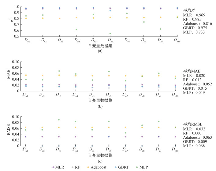 再者,MLR在采用不同自变量数据集时的预测R2的波动最小,其次为RF、Adaboost和GBRT。由此可见,MLR的预测R2的稳定性更高。最后,RF的平均预测误差最低,其次为GBRT和MLR,且GBRT和MLR的MAE基本相同。MLR的MAE标准差最小,而RF的RMSE标准差最小。在10组自变量数据集中,Dn7在除CART以外的机器学习算法中的平均预测R2最高(R2=0.929),且平均预测误差最低。Dn5、Dn2、Dn10在5种机器学习算法模型中的适用性仅次于Dn7。