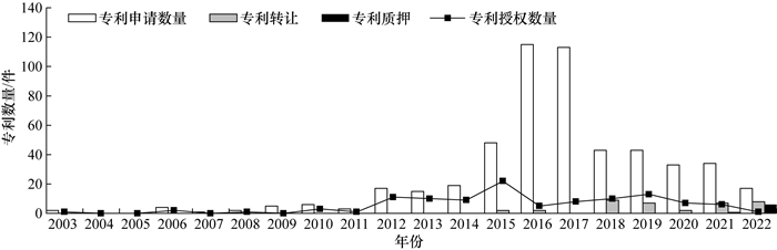2 结果与分析 2.1 脱硫石膏改良剂治理盐碱地专利发展态势 2.1.1 专利申请和授权概况由图 1可知,2003—2022年中国利用脱硫石膏改良剂治理盐碱地的专利申请数量变化趋势可分为3个阶段:第一阶段(2003—2011年)专利申请量较低,每年保持在10件以内,此时利用脱硫石膏改良盐碱地技术的相关研究还处于试验探索阶段。第二阶段(2012—2017年)专利申请量快速上升,每年申请20件以上,并在2016年达到峰值(115件)。这主要受益于国家级和省部级科研项目将脱硫石膏改良盐碱地技术纳入主要研究内容[10-12],重视并加强知识产权保护。第三阶段(2018—2022年)专利申请量急剧下降,逐渐回归到第二阶段的初始水平。这主要是由于脱硫石膏改良盐碱地技术日趋成熟,已经从科学研究转向成果转化,在规模化盐碱地改良中得到了广泛的应用并取得了明显效果[10]。