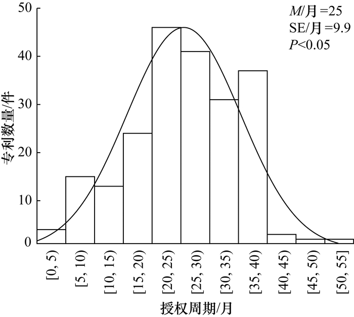 从专利的法律状态(见图 1)来看,2003—2022年已有21%(111件)的专利获得授权,而11%(57件)的专利尚处实质审查中。个别年份除外,专利授权数量占申请数量的比例呈逐年下降趋势。其中,2003—2015年专利授权比例高达50%以上,甚至全部授权(2003和2006年);2016—2022年专利授权比例呈现先增加后降低的趋势。截至2022年底,申请的专利中有73%(381件)处于无效状态,主要包括驳回(44%)、撤回(24%)和未缴年费而权利终止(5%)。这些专利的平均授权周期M为25个月,标准误差SE为9.9个月,整体P值小于0.05,符合正态分布(见图 2)。38%的专利从公开到授权耗时20~30个月,仅有极少数的专利授权周期超过40个月。