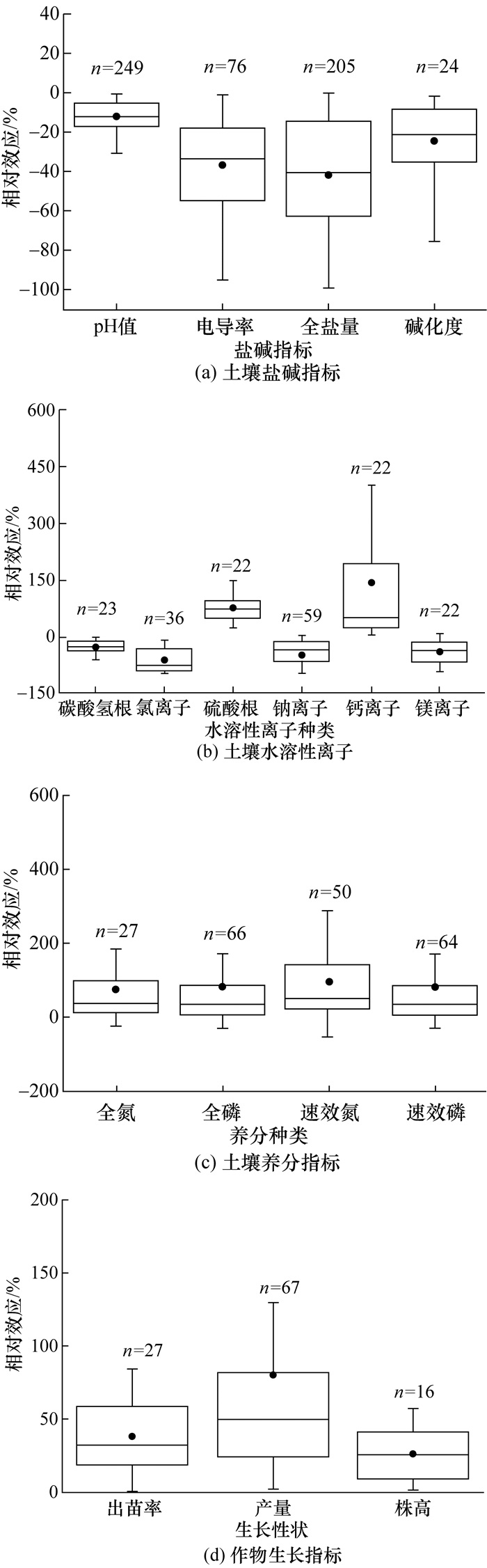 2.3.4 施用效果与不施用或施用其他类型改良剂相比,在盐碱地中施用脱硫石膏改良剂可明显降低土壤pH值、电导率、全盐量和碱化度,均值降低幅度达到10%~40%(见图 4a)。这主要是因为脱硫石膏溶解出来的Ca2+能够置换土壤胶体上吸附的交换性Na+,增大土壤阳离子交换量,并可与土壤中的CO32-和HCO3-发生化学反应,将对作物毒害作用较大的碳酸盐转化为毒害相对较小的硫酸盐[45-47]。此外,脱硫石膏改良剂中的有机物料、无机矿物等配料也能中和土壤CO32-和HCO3-,增强土壤降碱效果,同时还能够改善土壤结构、增加土壤通透性,进而促进土壤脱盐。