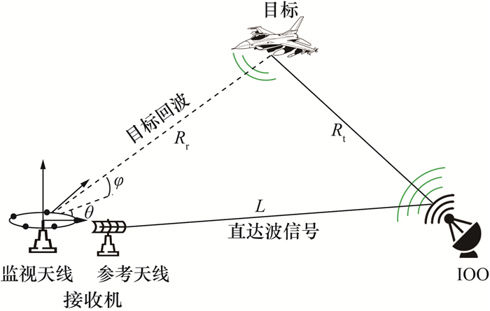1 系统结构和信号模型一般来说,一个典型的无源雷达系统包括一个IOO和一个接收机,如图 1所示。接收机具有两套天线:一套是参考天线,用于接收IOO发射的直达波信号;另一套是监视天线,用于接收目标回波。监视天线是由Nem个各向同性的全向阵元组成的均匀排列圆阵。