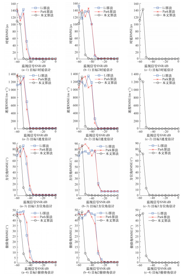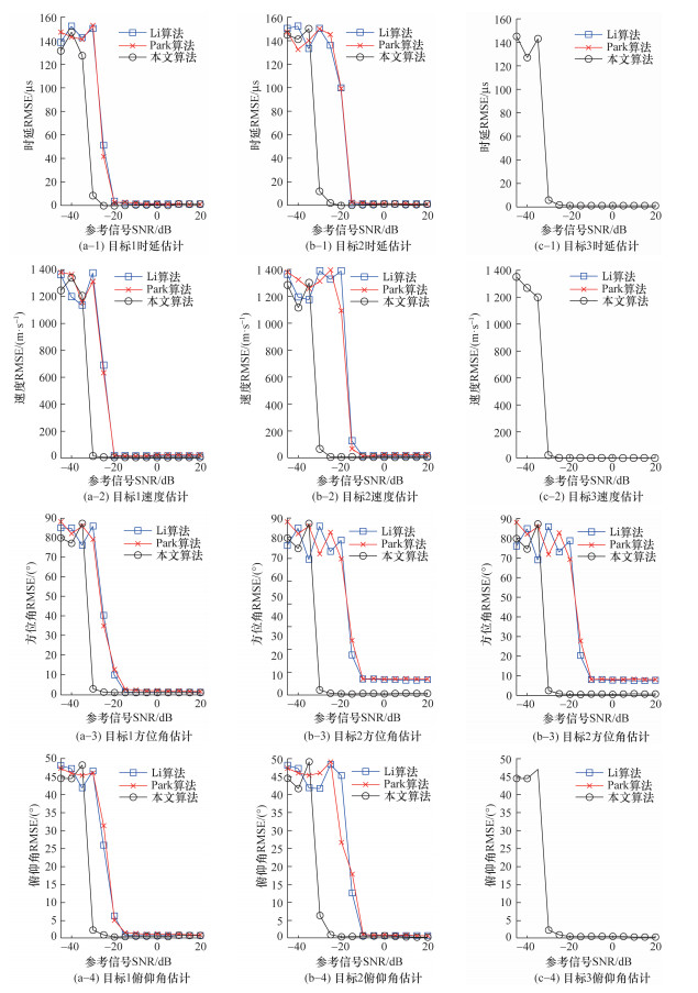 图 10给出了不同参考信号条件下,本文算法与Li算法、Park算法在时延、Doppler速度、方位角和俯仰角等参数估计性能方面的对比。显然,总体上参考信号信噪比越高,算法对于时延、Doppler速度、方位角和俯仰角的估计误差越小。但是,不同算法之间仿真结果的对比表明,本文算法在不同参考信号信噪比条件下,对3个目标信号的参数估计效果均优于Li算法和Park算法。具体来说,对于非相干的目标1信号,由于本文算法考虑并校正了目标高速运动引起的距离徙动,减小了时延和Doppler速度的估计误差,继而减小了后续的角度估计误差。因此,虽然在参考信号信噪比足够高的情况下3种算法都能稳定估计时延、Doppler速度、方位角和俯仰角,但本文算法的参数估计误差小于Park算法和Li算法,并且本文算法估计误差发生门限效应的阈值比Park算法低约15 dB,也就是说,本文算法可以在更低的参考信号信噪比条件下实现高速目标回波信号的参数估计。对于相干的目标2和目标3信号,仅本文算法可以分辨出目标2和目标3的信号,并准确估计2个目标的时延、Doppler速度、方位角和俯仰角。Li算法和Park算法未考虑同一时延-Doppler域内存在多个目标的情况,因此未对目标2和目标3的信号进行解相干,从而导致Li算法和Park算法在不同的参考信号条件下,无法分辨出目标2和目标3这2个信号,并且形成的合成来波方向的方位角误差显著大于本文算法。