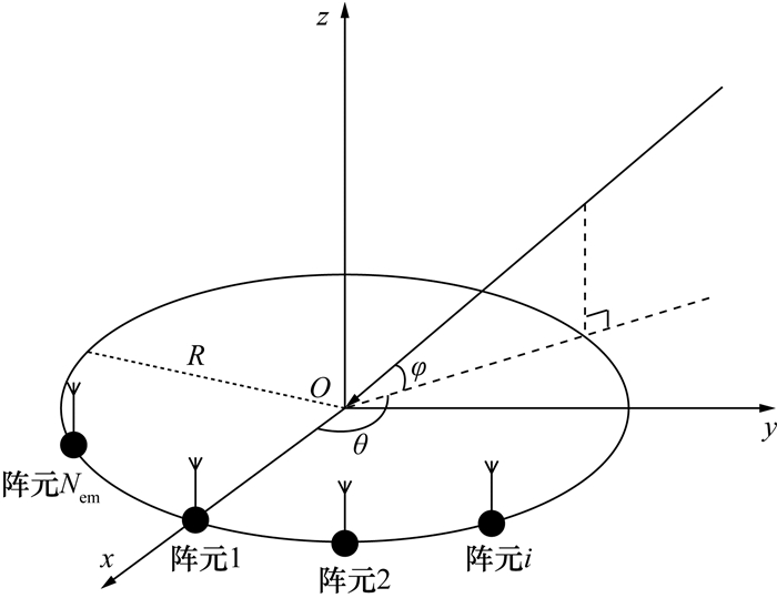 监视天线阵列结构如图 2所示。Nem个各向同性的全向阵元均匀排列在半径为R的圆周上,阵元夹角为2π/Nem,阵元1与x轴正方向的夹角为γ。假设第k个目标回波信号入射的方位角为θk,俯仰角为φk,其中方位角定义为入射信号在x-y平面投影射线与x轴正方向的夹角,俯仰角定义为入射信号与其在x-y平面投影射线之间的夹角。