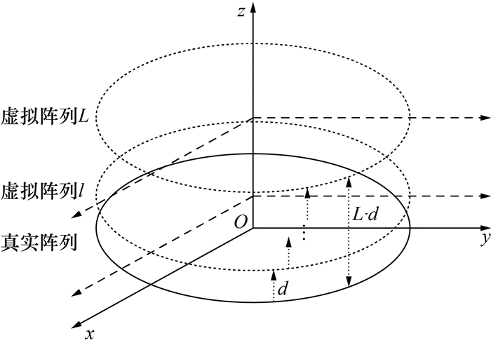 用MUSIC算法估计信号角度时需假设入射信号互不相干,然而实际中P个目标回波信号的Doppler频率可能相同或不同,意味着信号s1(t′m), …, sp(t′m)中可能存在相干信号,此时矩阵Rss和Rxx不满秩,因此大特征值的数量小于P。这里假设P个信号中存在L个相干信号,P-L个非相干信号,那么可知rank(Rs)=P-L+1=Q。此时MUSIC空间谱只能估计出P-L个不相干信号的来波方向和一个由相干信号合成向量求得的虚假来波方向。因此,需要通过解相干处理,使协方差矩阵恢复满秩。这里采用UCA阵列虚拟平移方法实现信号的解相干。天线阵列z轴虚拟平移如图 5所示。