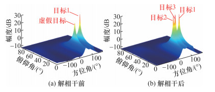 对时延-Doppler图进行恒虚警检测(constant false alarm rate detector, CFAR),提取目标真实时延所在的时延单元对应的慢时间维信号,形成虚拟阵元慢时间维度多快拍信号,然后结合阵列虚拟平移解相干和MUSIC算法,进行空间谱估计,结果如图 9所示。作为对比,未进行解相干处理而直接利用MUSIC算法进行空间谱估计的结果也被一并给出。结果表明,未进行解相干处理时,MUSIC空间谱仅在(90°, 30°)和(51.5°, 30°)附近形成2个强峰,其中(90°, 30°)对应目标1真实来波方向,(51.5°, 30°)为目标2、3相干信号合成的虚假来波方向。与之对比,本文算法经过阵列虚拟平移解相干和MUSIC算法处理后,可以清楚地分辨出位于(90°, 30°)、(45°, 30°)和(60°, 30°)的3个强峰,分别与目标1、2、3真实来波方向吻合。
