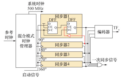 1.2 一次时间内插模块一次时间内插模块是缩短延迟链的关键部分,其具体结构如图 3所示。混合模式时钟管理器生成4个500 MHz的内插时钟信号(相位分别为90°、180°、270°和360°),专用于对启动信号的量化。如图 3所示,同步器由D触发器(D flip-flop, DFF)构成,用于识别启动信号的相位并与对应相位时钟信号的上升沿同步,输出同步信号。采用2个连续的DFF进行同步操作以降低亚稳态产生的概率。同步器产生的同步信号有2个作用:一方面,经过或门产生一次同步信号,用于二次时间内插模块进一步量化;另一方面,经过反相器与产生该信号的同步器的上一同步器中第2个DFF的使能信号端CE连接(图中红线标示)。这种连接方式可使4个同步器在启动信号位于不同相位时输出对应的one-cold码,判断启动信号所在相位并输入到编码器中得到TFn。