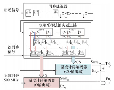 延迟链使用双端采样法构建,其由进位链单元Carry8和DFF构成,Carry8的求和输出端O和进位输出端CO都被用作抽头,对经过同步延迟器调整后的启动信号与一次同步信号之间的时间间隔进行量化。相比于常见的只使用CO输出端作为抽头构建延迟链的方式,双端采样法在相同时间间隔内插入了2倍的延迟单元,分辨率能够提升2倍。考虑到器件位置、布局布线和温度的影响,一次时间内插模块中时钟周期均匀分割存在误差,因此实际设计时抽头延迟链长度需略宽于1/4个Tsys。
