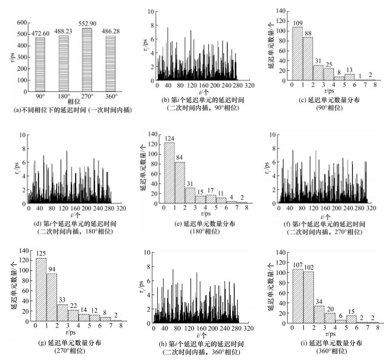 其中W为总的有效抽头数,即总延迟不为0的延迟单元个数。在本文中W为4个相位所用有效延迟单元数的总和,结合图 5可得W=277+288+310+288=1 163个。因此基于两次时间内插的FPGA-TDC的LSB为1.72 ps。