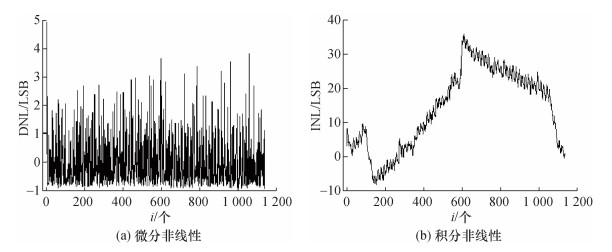 | $ \mathrm{INL}_i=\sum\limits_{x=0}^i \mathrm{DNL}_x. $ | (9) |