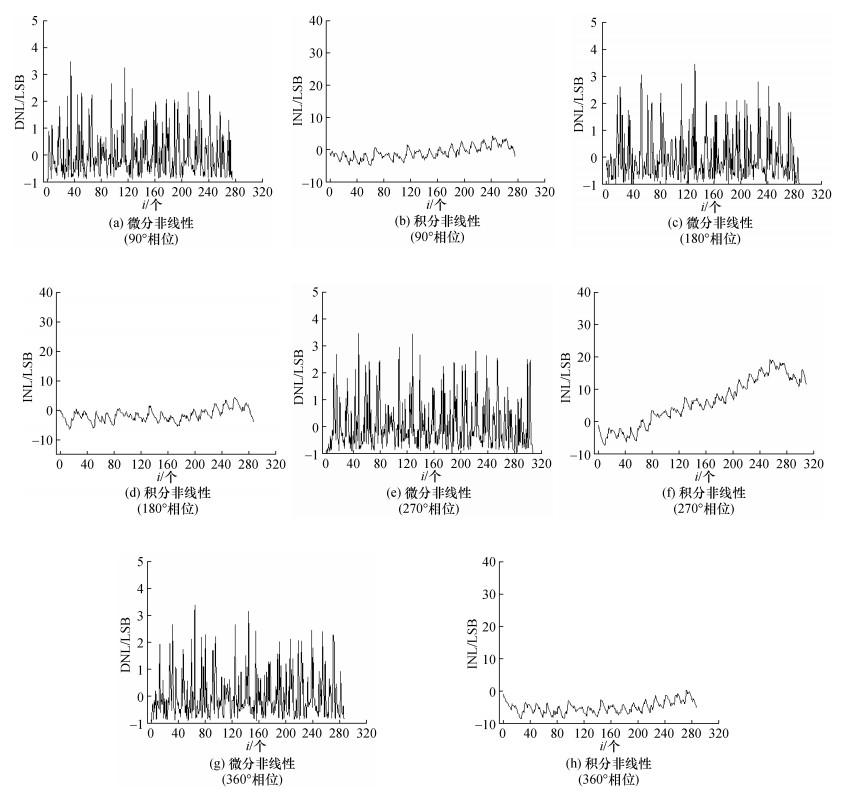 基于两次时间内插的FPGA-TDC的非线性测试结果如图 8所示。90°相位下的DNL为[-0.95, 3.49] LSB,INL为[-4.95, 4.25] LSB;180°相位下的DNL为[-0.99, 3.47] LSB,INL为[-6.69, 4.27] LSB;270°相位下的DNL为[-0.99, 3.50] LSB,INL为[-7.28, 19.27] LSB;360°相位下的DNL为[-0.92, 3.41] LSB,INL为[-8.75, 0.28] LSB。其中DNL和INL在270°相位下的极差最大,分别为4.49 LSB和26.55 LSB。
