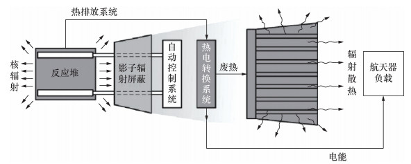 1) 受限空间下的稳定传热问题。在空间核反应堆电源系统中,系统的设计和布局通常比较复杂。如图 2[19]所示,系统需要在有限的空间内布置反应堆、传热部件、屏蔽器与热电转换装置等多个组件。这种结构复杂性不仅增加了系统的设计难度,而且可能导致热能传输路径长、热损失大,进而影响系统的效率和可靠性。