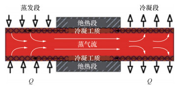 2.1 高温热管概念及原理以碱金属单质或者合金为工质的热管,称为碱金属热管或液态金属热管,可以稳定运行在750 K以上,按其工作温度划分为高温热管类别,具有良好的传热能力[21-22]。图 3[23]展示了高温热管运行原理:热源作用于高温热管蒸发段,蒸发段内的固态工质吸热后温度不断升高并熔化为液态。液态工质继续升温在吸液芯表面气化,蒸发段的局部压力使蒸气沿管道向前流动,在冷凝段释放热量后冷凝为液态工质,并在回复力的作用下(吸液芯毛细力、重力等)回流至蒸发段,如此不断循环,将热量从蒸发段传递到冷凝段。