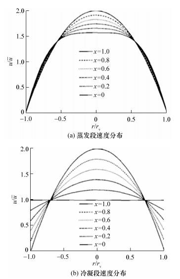 其中:pe, Im为蒸发段压降,pc, Im为冷凝段压降,Rer为径向Reynolds数。改进的计算方法弥补了Busse计算方法中蒸发段流量略大以及冷凝段压力恢复过大的不足,且适用于各个范围的Rer。设黏性力产生的压降与总压降的比值为x,则惯性力为1-x,改进后蒸发段与冷凝段的速度分布为: