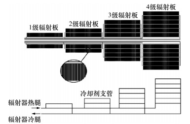 3.3 空间反应堆用高温热管散热器高温热管在空间反应堆中还可用于散热器中,将能量转换系统中的废热排出。高温热管辐射器散热系统基于当前的高温热管和辐射面板技术,具有较高的成熟度和工程可行性,已成为航天电力系统的主要选择。张文文等[14]设计了用于空间反应堆动力系统的钾热管辐射散热器,将辐射板按照数量分为4级,通过冷却剂支管与热管相连(如图 7[14]所示),该设计能够满足系统废热排出的需求。Zhang等[116]设计了用于空间反应堆的钾热管散热器,通过数值计算分析了热管散热器的特性,并与泵回路散热器进行了比较,发现采用热管设计可以克服单点故障问题,具有良好的等温性。